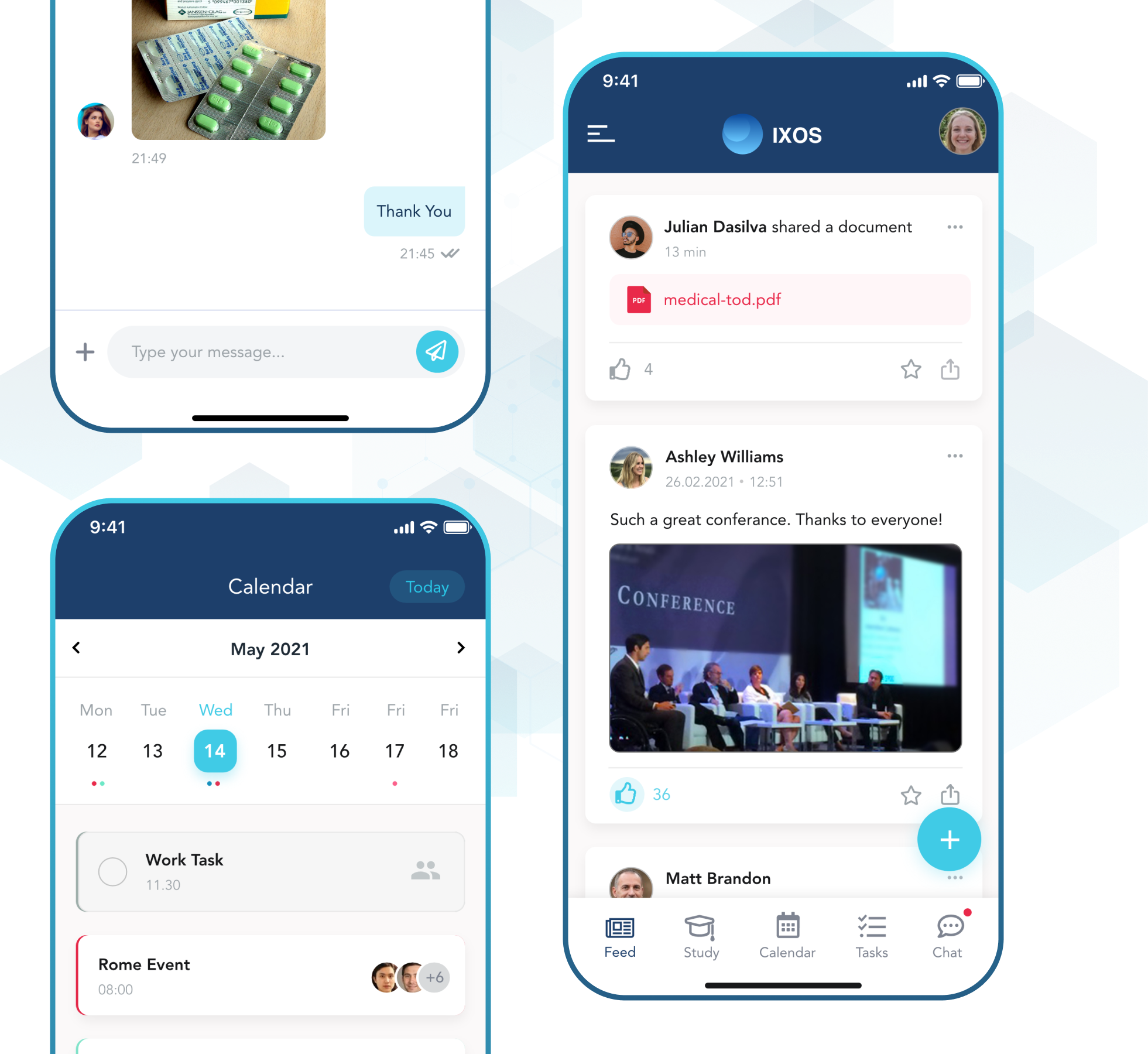 The IXOS.team app, developed for Pharmatechnik GmbH & Co. KG, enhances secure communication in pharmacies. The app offers individual and group chats, task lists, appointments, a news board, and the ability to send and receive documents. The UX/UI was prototyped with Adobe XD and developed with Xamarin Forms.